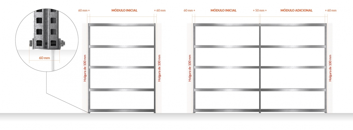 Módulo inicial: é composto de 4 escoras verticais e do número pretendido de prateleiras. Pode ser instalado de forma independente, sem necessidade de união a outro módulo. São sempre o ponto de partida de um linear de estantes.